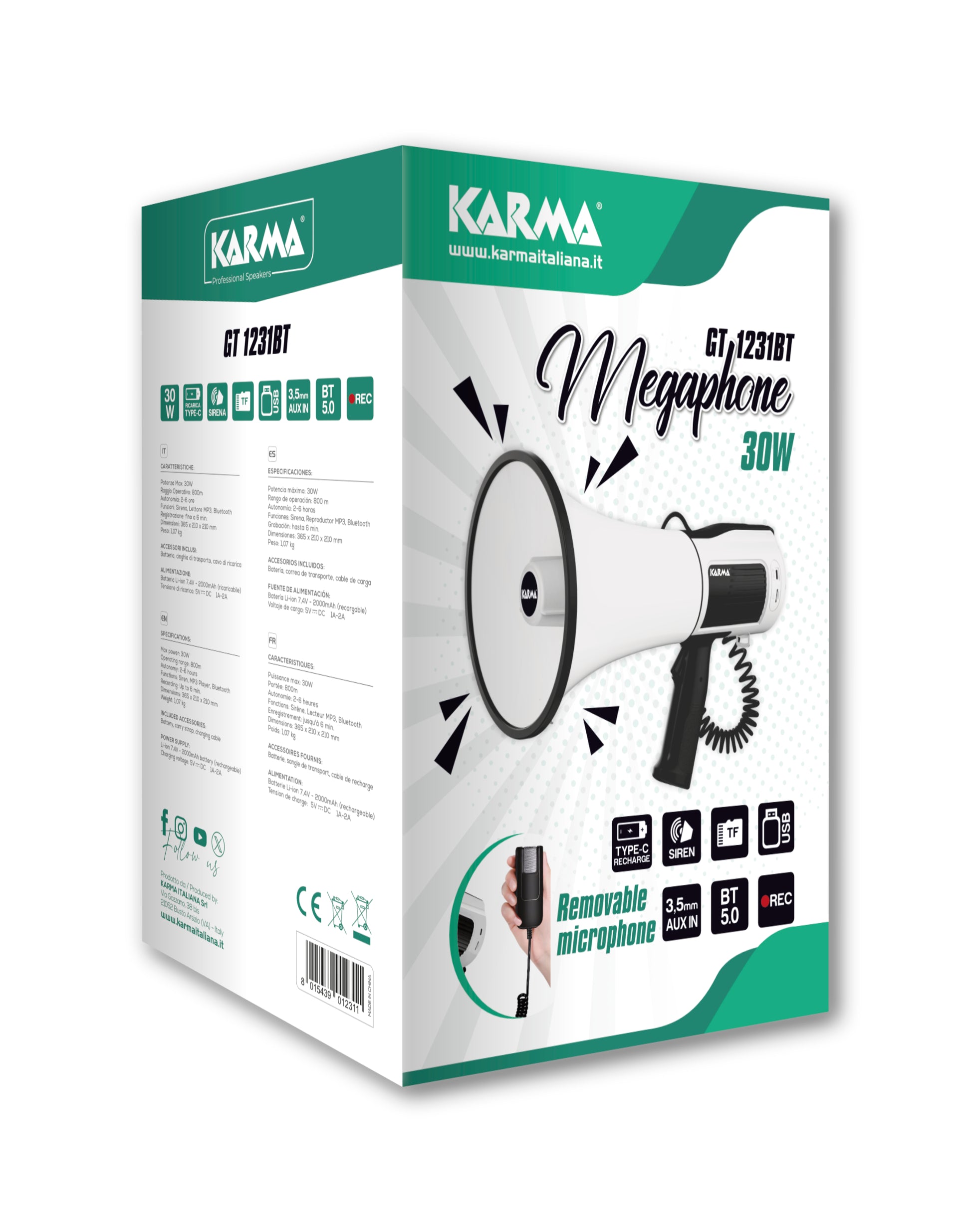 Megafon ima ugrađenu punjivu bateriju koja se puni putem USB-C priključka što omogućuje rad bez kablova i dodatne opreme. Povezivanje putem Bluetootha omogućuje reprodukciju zvuka izravno s pametnog telefona dok USB i SD utor pružaju mogućnost puštanja unaprijed snimljenih poruka ili glazbe. Uređaj dolazi s vanjskim mikrofonom za jednostavno i ugodno korištenje.