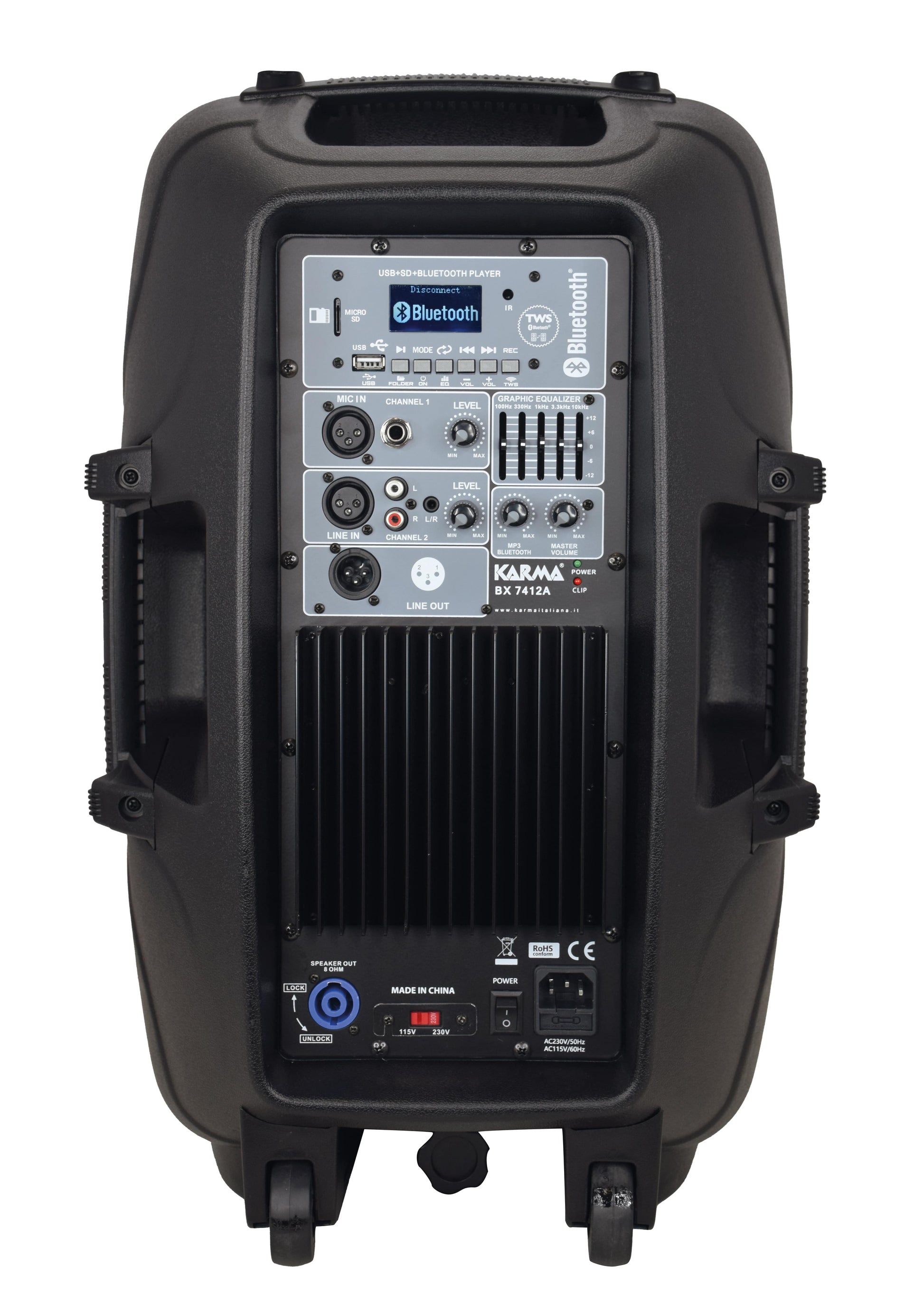 Vrlo moćan i s izvanrednim rasponom funkcija. Opremljen je 12" wooferom i titanium tweeterom, oba vrlo dobre kvalitete. Dolazi s 5-pojasnim grafičkim ekvilajzerom, Mp3 playerom preko SD/USB-a i utičnicom zamišljenom za spajanje pasivnog zvučnika (BX 7412). Također uključuje daljinski upravljač i bluetooth prijemnik.