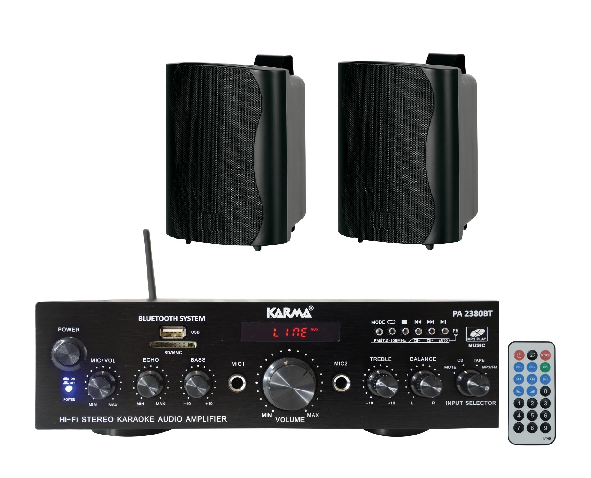 Dizajnirano za korištenje u trgovinama, recepcijama ili domovima. Ima 4 ulaza, 2 za spajanje 2 mikrofona (preko prednjih utičnica) i 2 vanjska uređaja (kao što su CD playeri, dekoderi itd.) sa stražnjim RCA utičnicama. Sprijeda se nalaze SD i USB utičnice s tipkama za reprodukciju MP3 pjesama. Također ima Bluetooth funkciju za reprodukciju pjesama s pametnog telefona ili tableta, regulator eho efekta, balans i visoke/bas tonove. Uključuje FM radio. Daljinski upravljač za daljinsko upravljanje Mp3 pjesmama upotpunjuje ovaj izvanredni uređaj.
