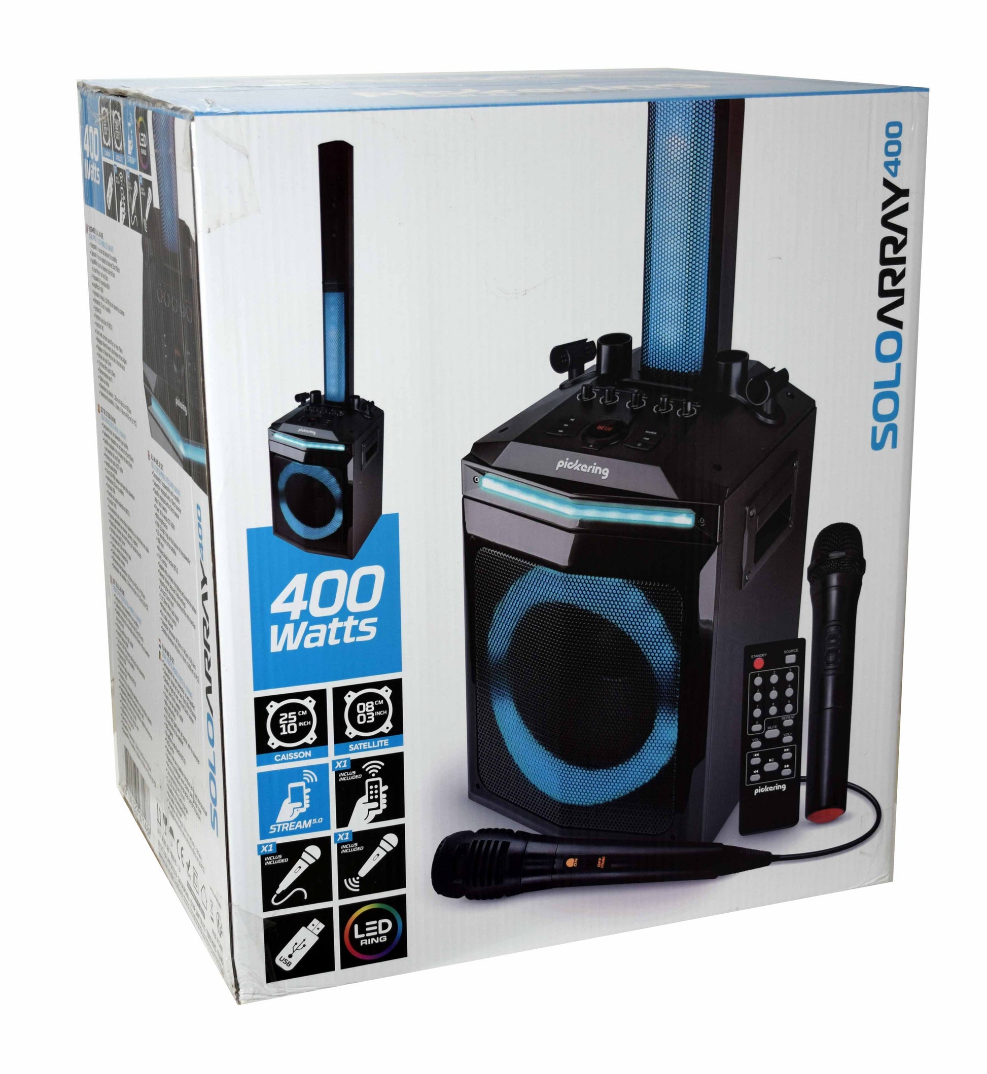 Zadivljujući sustav od 400 W, kompaktan, ali iznimno svestran. Idealno za DJ-eve, zabave i karaoke. Uključuje subwoofer, dva satelita koja se mogu složiti, bežični mikrofon i žičani mikrofon. I subwoofer i sateliti opremljeni su LED svjetlosnom animacijom (3 boje i tri efekta). Među glavnim značajkama ovog proizvoda su: USB ulaz, bluetooth, TWS funkcija, opće podešavanje glasnoće, upravljanje visokim/basom, podešavanje glasnoće mikrofona i funkcije jeke. Praktični daljinski upravljač omogućuje daljinsko upravljanje. Također je opremljen 3,5 mm jack AUX ulazom i 2 ulaza za mikrofon. Aux kabel uključen.